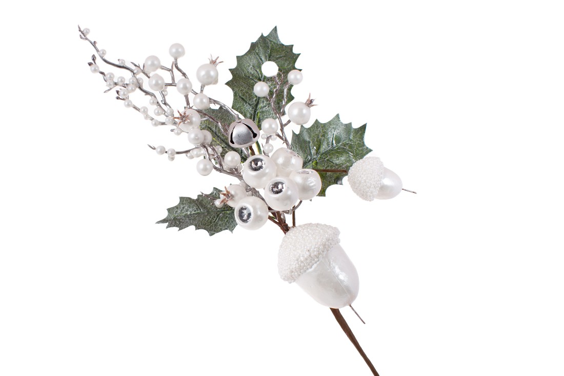 Гілка з листя, жолудей і білих ягід з кристалом, 40см