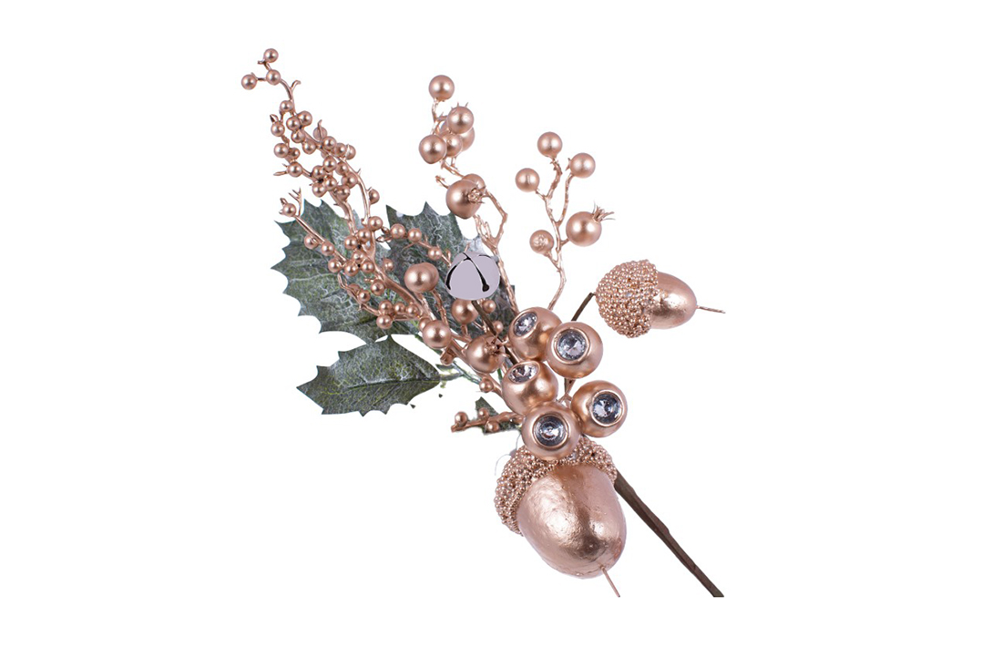 Гілка з листя, жолудей та золотих ягід з кристалом, 40см