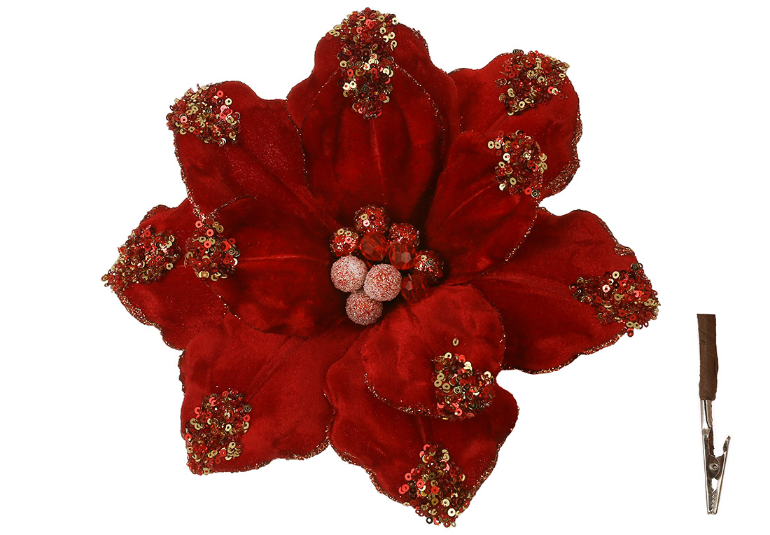 Оксамитова квітка Магнолія на кліпсі, з бісером та паєтками D27см, колір - червоний з золотом