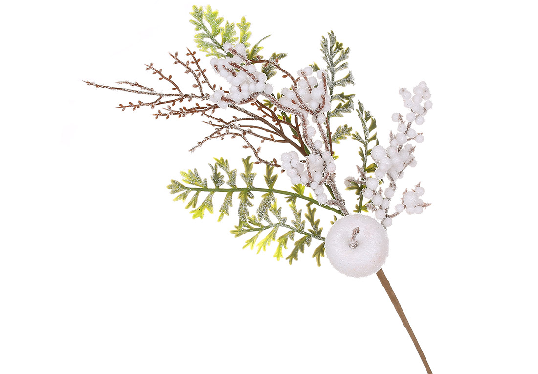 Декоративна засніжена гілка хвої з ягодами та яблуком, 40см, колір - білий